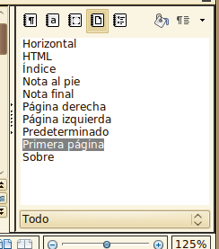 Una vez creada la carátula, conviene marcar a esa página con el “estilo de página” correcto. Es que no sólo hay estilos de párrafo o de letra, también hay estilos de página y asignar correctamente el estilo de la carátula va a servir para que en ésta no aparezcan ni números de página, ni otras cosas que querramos que aparezcan en el pie de página, o en la cabecera de todo el resto del documento. Para marcar la página como carátula elegimos el simbolito “página” en la ventanita de estilos (está en la barra horizontal en el margen superior del cuadro de estilos) y luego hacemos doble click en “primera página”, para que quede así: